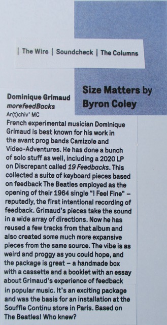 Une chronique très positive de morefeedBacks par Byron Coley dans sa rubrique Size Matters du magazine britannique The Wire (numéro 462 / August 2022).